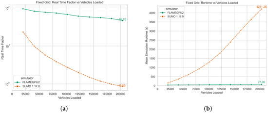 In Figure 3a, the real-time factor (RTF) is plotted on a logarithmic scale (y axis) to compare the performance of FLAME-GPU with SUMO. As the number of vehicles in the simulation increased, SUMO showed a significant drop in performance, whereas FLAME-GPU maintained a consistently high RTF. By the end of the simulation, FLAME-GPU achieved an average RTF of around 99, compared with SUMO’s 1.45. This demonstrates that FLAME-GPU can handle a larger number of vehicles much faster than SUMO. Similar results can be seen in Figure 4a and Figure 5a.