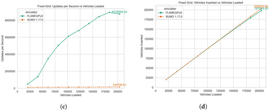 The final benchmark, shown in Figure 3d, evaluated how quickly the simulation could calculate available spots on the street network for inserting new vehicles. In this test, SUMO performed better, demonstrating higher efficiency in loading vehicles into the network. The results also show that FLAME-GPU’s insertion rate decreased as the number of vehicles increased. This reduction was likely caused by small differences in how congestion was cleared over time. If vehicles join queues faster than they leave, then these small differences can accumulate, reducing the number of available spots for inserting new vehicles. A similar pattern can be observed in Figure 4d and Figure 5d.