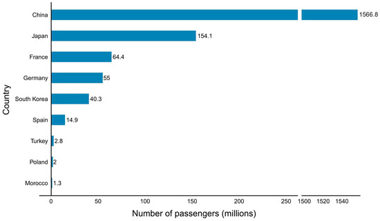 HSR has emerged as a transformative transportation infrastructure that has revolutionized mobility and shaped regional development in the modern era. At the end of 2020, the mileage of High-Speed Railway in operation in China had reached 38,000 km, approximately two-thirds of the total operational mileage of HSR in the world. Figure 1 shows the number of HSR passengers (millions) in 2020. The ongoing construction of HSR networks is expected to persist, especially in major emerging economies in the Southern Hemisphere [16].