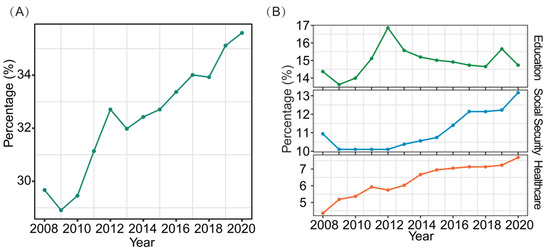The proportion of BPS expenditures in China’s general public budget expenditure. (A) The percentage of BPS expenditures from 2008 to 2020. (B) The percentage of education, social security and healthcare expenditures from 2008 to 2020.