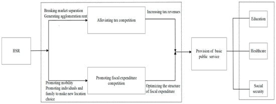 HSR compresses the spatial and temporal distance between cities. On the one hand, HSR promotes the flow and agglomeration of labor and other factors of production between cities, prompting individuals and families to make new location choices [26,52]. Individuals and families make new location choices not only to increase their income but also to enjoy better BPS in cities. The level of public service is an important factor influencing labor inflow [50]. Ji et al. [53] integrates physical constraints and deep learning for trajectory tracking, offering useful insights for understanding how HSR systems may in turn influence urban policy behavior. Talent resources have become a significant embodiment of city competitiveness. HSR reduces the time and space costs of labor mobility and improves its efficiency. In addition, HSR provides more possibilities for residents to access high-quality BPS, and the opening of HSR enhances the bias of the local government’s livelihood expenditures [21]. On the other hand, the construction of transportation infrastructures, such as HSR, contributes to market integration, reduces the degree of market segmentation [23], and effectively reduces the cost of the flow of production factors and the degree of information asymmetry [31]. Within the analytical framework of new economic geography, market integration promotes economic agglomeration and gives rise to the phenomenon of “agglomeration rent”: enterprises have a higher rate of return on capital due to a decline in trade costs and the spillover of knowledge and technology, resulting in an agglomeration effect that entices enterprises to relocate. Local governments levy taxes on agglomeration rent to increase tax revenues, and enterprises’ returns via agglomeration rent reduce their sensitivity to the tax rate [54]. Enterprises would not relocate to new regions due to local government tax rate adjustments. “Agglomeration rent” weakens the incentives for local governments to engage in TC, which leads to the race to the bottom [55,56]; increases government tax revenue; optimizes the structure of fiscal expenditure; and increases the provision of BPS. Based on this, this paper proposes the following hypothesis:
