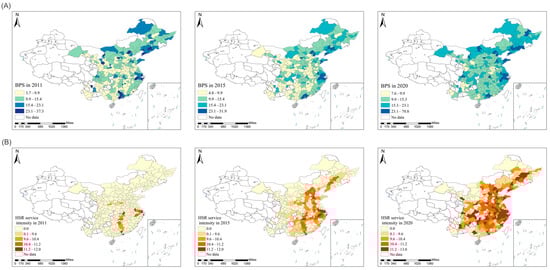 BPS and HSR service in 2011, 2015, and 2020. (A) BPS in 2011, 2015 and 2020. (B) HSR service in 2011, 2015, and 2020.