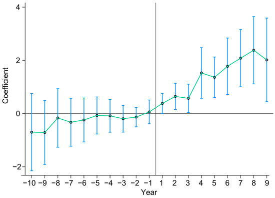 This study establishes a 19-year observation period (spanning from 10 years before to 9 years after the opening of HSR, which is denoted by ) to implement the parallel trend test. Under the DID framework, the validity of the parallel trend assumption is supported if all pre-intervention coefficients for HSR remain statistically insignificant but statistically significant in any year subsequent to it.