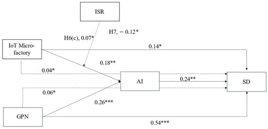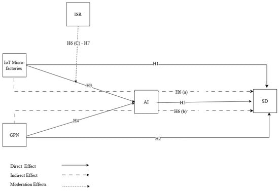 Architectural innovation functions as a mediating construct, acting as the conduit through which IoT micro-factories influence sustainable development. It leads to modification of the layout of the existing system with IoT capability, which, in turn, increases production performance, fosters equitable trade that embodies integrative cooperative industries, and promotes open interactive innovation []. IoT capabilities enable connectivity with large-scale industries (LSIs), facilitate sharing of inter-firm infrastructures based on their production metric []. This industrial symbiosis extends from production tasks and the supply chain to the affiliation of inter-trading industries, fostering internalisation of manufacturing and transition into associate or affiliated companies [,].