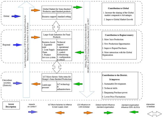 The IoT micro-factory enables citriculture societies to access the global market through the global production network (GPN) and to leverage comparative advantages in global markets []. The GPN facilitates a sustainable transition in production and influences societal consumption patterns by introducing new products in a specific context []. The global commodities chain (GCC) consists of various industries in a production network, representing a collaborative effort among original equipment manufacturers (OEMs). Thus, different manufacturers produce distinct components for the same product. The global consultancy of international benchmark organisations has established regulations to govern standards that ensure the quality of products and services within GVC, such as ISO, WTO, and UN Comtrade. Both GCC and GVC promote the advancement of citriculture through the development of IoT micro-factories, which meet product standards and facilitate access to global markets [].