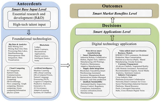 ST has been interpreted and developed through two primary paradigms: data-driven smart manufacturing and value-added smart servitization. These perspectives represent distinct yet complementary approaches to integrating advanced technologies into industrial ecosystems. Data-driven smart manufacturing emphasizes the implementation of cutting-edge technologies within fully integrated and collaborative manufacturing systems [31]; it underscores enhancing multiple operational dimensions such as production efficiency, operational flexibility, and sustainability [25,32]. For instance, by implementing real-time monitoring systems, manufacturers can optimize energy consumption and reduce waste, contributing to more sustainable practices. Additionally, this approach promotes smart working practices, which involve leveraging automation and artificial intelligence to streamline workflows and improve decision-making processes. Value-added smart servitization represents a more advanced form of service-oriented transformation compared to traditional digital services. It not only incorporates connected, intelligent, and autonomous product–service systems but also involves adopting process–customer-oriented business models [33,34]. Such models typically leverage data analytics to understand customer preferences and tailor offerings accordingly, and enterprises can design their operations around delivering personalized experiences and supporting open-service value co-creation.