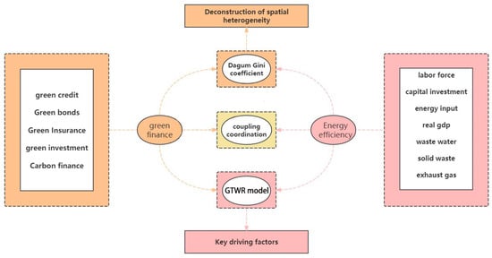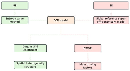 Based on the aforementioned theories, this study constructed a three-dimensional framework of “system coupling diagnosis–spatial heterogeneity deconstruction–driving effect analysis”, as shown in Figure 1. In terms of system coupling diagnosis, an improved EBM model incorporating spatial correlation effects was established by integrating environmental economics and complexity science theories. This model comprehensively considers the interactions between GF and EE as well as the influence of neighboring provinces to more accurately assess EE. For spatial heterogeneity deconstruction, an in-depth examination of regional variances in GECC was conducted using the Dagum Gini coefficient decomposition approach, including within-group differences, between-group differences, and the supravariation density term, revealing the evolution patterns of regional development. On the driving effect analysis level, based on the GTWR model, the synergistic effects of multi-level policy tools and non-market factors were systematically analyzed to identify key driving factors, providing a scientific basis for regional differentiated policy design.