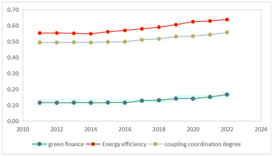 There is a complex interrelationship between GF and EE, and its theoretical foundation covers multiple disciplines. From the perspective of economic theory, the concept of externalities forms a crucial foundation for the synchronized evolution of GF and EE []. In the process of energy production and consumption, there are negative externalities, such as environmental pollution. GF internalizes environmental externalities by guiding capital towards green and efficient energy projects, prompting enterprises and society to bear environmental costs and thereby achieving improvements in EE and environmental protection []. For example, policies related to green credit escalate the funding expenses for businesses that are energy-demanding and emit a lot of pollution, restricting their expansion, while providing low-cost funds for energy-saving and environmentally friendly projects: incentives for companies to improve EE.