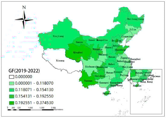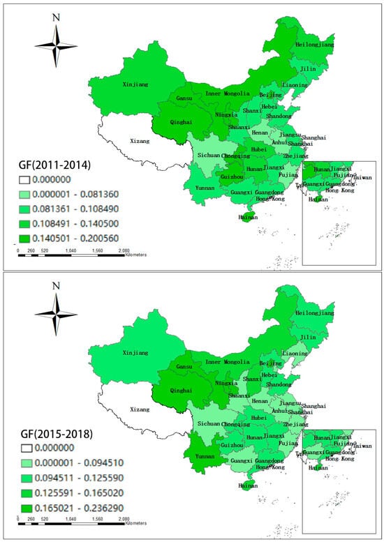 Between 2011 and 2022, China’s CDGF showed significant improvement and regional diffusion characteristics. As shown in Figure 4 (average of four years from periods of 2011–2014, 2015–2018, and 2019–2022, respectively), the highest indicator range of each province expanded from 0.200560 in 2011–2014 to 0.374530 in 2019–2022. Policy promotion and market innovation formed the core driving forces. Regarding geographical spread, the eastern coastlines maintained their leading position, whereas the western areas stayed undervalued for an extended period, indicative of the varying degrees of economic base, fiscal means, and policy reaction skills. It is worth noting that central provinces and some western hub cities achieved leapfrog development through pilot policy implementation and industrial transformation, entering the upper-middle range in 2019–2022. This indicates that GF has shifted from a single-pole drive to a multi-center coordinated development.