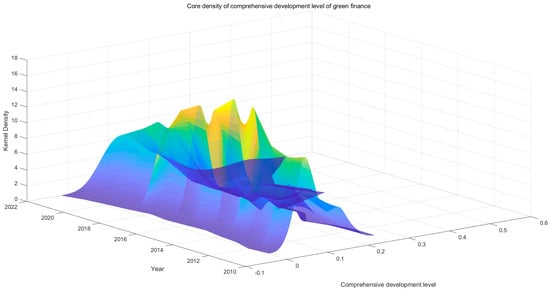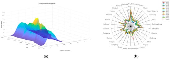The kernel density evolution of GECC in Chinese provinces from 2011 to 2022 shows significant spatiotemporal heterogeneity. As shown in Figure 9a, the coordination degree distribution curve shifts to the right as a whole, with the main peak interval steadily rising from the initial 0.45–0.55 to the final 0.65–0.75, indicating a leap in overall coordination. However, regional differentiation has also deepened simultaneously: the single-peak, right-skewed shape before 2017 reveals a universal improvement (covering 60% of provinces), and the subsequent emergence of a double-peak structure (main peak 0.65–0.7, secondary peak 0.5–0.55) reflects the binary split between the leading transformation areas (YRD, PRD, and eight provinces, with a kernel density peak of 14) and the path-dependent areas (the three northeastern provinces, with a kernel density of only 2). The dynamic evolution is dominated by three mechanisms: First, the technological spillover from the GF reform pilot zones creates a pole-lifting effect, promoting the dense extension of high-value areas. Second, the northeastern and northern Chinese heavy industrial provinces are constrained by the rigidity of energy consumption, and the long-tail adhesion phenomenon of the low-value area continues. Third, the Yellow River Basin strategy has triggered Henan, Ningxia, and other provinces to achieve a leap to medium and high values through targeted green credit allocation, significantly narrowing the distribution standard deviation. In the future, it is necessary to quantify the spatial correlation intensity using semi-parametric kernel regression and focus on the phase transition threshold of provinces in the critical area (0.5–0.55) to provide dynamic evidence for breaking regional lock-in barriers.