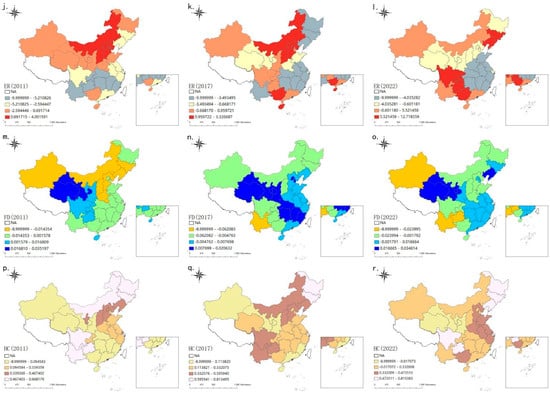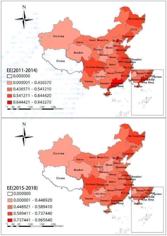 EE in Chinese provinces showed significant spatial differentiation and dynamic convergence characteristics from 2011 to 2022. As shown in Figure 6 (average of four years from the periods of 2011–2014, 2015–2018, and 2019–2022, respectively), in terms of regional patterns, the eastern coastal areas maintained high EE levels (0.78–1.00), with obvious advantages in technology-intensive industries and clean energy infrastructure. The western regions remained in the low-efficiency range (<0.44) for a long time, with economic structures relying on resource development and energy-intensive industries as the main constraints. Central and western provinces had a faster increase in efficiency, but the absolute gap did not significantly narrow, and regional imbalances persisted. In the temporal dimension, the upper limit of national EE values increased from 0.94 (2011–2014) to 1.00 (2019–2022), reflecting the strong driving force of policy intervention (such as the dual carbon goals) on technological iteration in the east. However, the lag in technological diffusion in the west led to a pronounced Matthew effect of “eastern rise and western stagnation”.