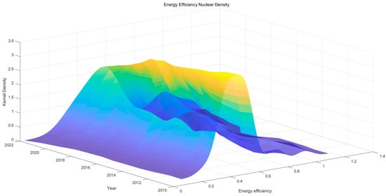 The kernel density distribution of EE in 30 Chinese provinces from 2011 to 2022 shows significant stage-by-stage evolution characteristics, reflecting the game between policy drive and technological diffusion. As shown in Figure 7, the overall distribution evolved from the initial wide peak single state (2011–2015) to a double peak convergence (2016–2019) and finally formed a right-skewed, long-tailed shape (2020–2022) under the dual carbon goals. The density of high-efficiency provincial groups (>0.8) increased sharply (peak height 3.3), and the main peak shifted to the right to 1.05, indicating that TI in the east (such as the large-scale application of new energy and digital EE management) drove an absolute leap in efficiency. However, the western region, long limited by resource dependence and technological lock-in, continued to have a secondary peak in the low-efficiency range (0.4–0.6), forming a “dual-speed differentiation” pattern between the east and the west. This differentiation essentially stems from the regional imbalance in policy response: the east accelerated technological iteration through market incentive mechanisms (such as carbon trading pilots), while the west faced fiscal constraints and industrial inertia. In the future, it is necessary to strengthen cross-regional technological collaboration (such as targeted docking between eastern technology parks and western bases) and establish an EE compensation fund to break the “low-carbon transition trap” of resource-based provinces. At the same time, dynamic kernel density parameters (kurtosis and skewness) should be included in the policy evaluation system to achieve the dual goals of efficiency improvement and regional fairness.