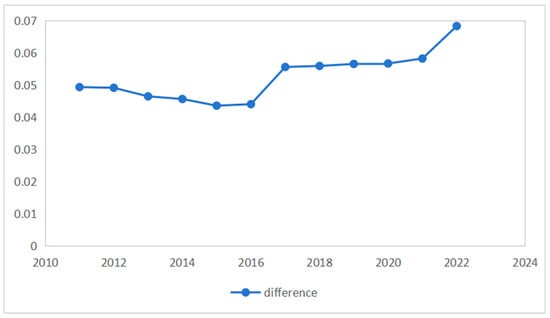 (2) According to the Dagum Gini coefficient, the regional variances in GECC are growing in a non-equilibrium manner, with the rate at which differences between groups contribute rising from 22.0% in 2011 to 40.7% in 2022. The coordination degree gap between the east and west has expanded by 85%, and the north–south growth rate difference has widened to 1:1.6, forming a “double scissor difference”. The violent fluctuation of the supravariation density term indicates that the polarization effect of policy pilots and local protective emission reduction have led to a rebound in negative spillover effects, highlighting the institutional fragility of cross-regional cooperation mechanisms;