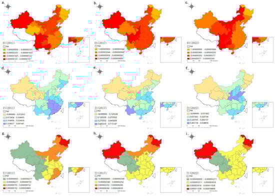 Here, (πi, αi, ti) represents the spatiotemporal location of province i, and Xij represents the observed value of province i in the j-th independent variable x. Based on the existing literature, this study selected six driving factors: ES, IS, TI, ER, FD, and HC.