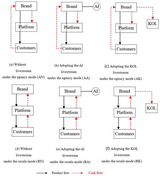 We consider an e-commerce supply chain consisting of a brand (subscripted as ) and a platform (subscripted as ). We use the superscript to denote the strategies adopted by the brand or platform, where represents the livestream scheme, the brand sells products through the platform and can choose from three methods of traffic generation: without livestream (superscripted as ), adopting AI livestream (superscripted as ), or adopting KOL livestream (superscripted as ). And indicates the sales mode. Two platform modes exist: the agency mode (superscripted as ) and the resale mode (superscripted as ). Under the agency mode, the brand sells its products at the retail price on the platform, with the platform merely serving as a marketplace that facilitates transactions, with the platform’s revenue sharing rate being . To reflect real-world scenarios and focus on valuable insights, it is assumed that the platform’s revenue sharing rate does not exceed 25% [14,38,39]. For instance, the revenue sharing rate on Taobao’s livestream platform generally ranges from 10% to 20%, while Amazon’s platform charges between 6% and 25%. Under the resale mode, the brand sells the product to the platform at a wholesale price of , and the platform resells it to consumers at a retail price of . Based on this background, the research covers six game modes: without livestream under the agency mode (AN), adopting the AI livestream under the agency mode (AA), adopting the KOL livestream under the agency mode (AK), without livestream under the resale mode (RN), adopting the AI livestream under the resale mode (RA), and adopting the KOL livestream under the resale mode (RK). The study systematically explores how the livestream scheme and sales mode impact pricing decisions and performance. The structure of the e-commerce supply chain is shown in Figure 1.