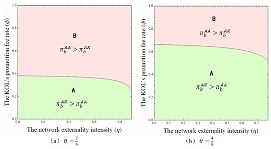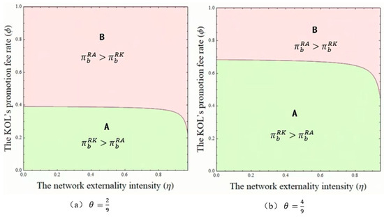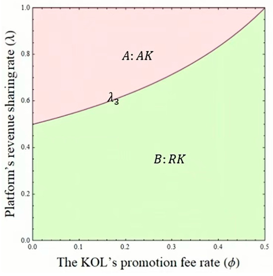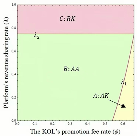Proposition 5 shows that both the retail price and market demand in the AK scenario are higher than in the AN scenario. When the KOL promotion fee rate is low or when both the KOL’s promotion fee rate and network externality are high, the brand and platform profits in the AK scenario are superior to those in the AN scenario. This is because, in the AK scenario, the brand uses KOL livestream to promote its product, which increases consumer trust and engagement. This influence allows the brand to set a higher retail price because consumers perceive additional value in the product as introduced by the KOL. Additionally, due to the KOL’s vigorous network externality intensity, more consumers are attracted, resulting in higher market demand in the AK scenario compared to the AN scenario. When both the KOL’s promotion fee rate and network externality are high, in the AK scenario, even though the brand needs to pay a higher promotion fee to the KOL, the increased network externality enhances consumer trust in the product, driving purchase behavior and boosting sales revenue for both the brand and the platform. When the KOL’s promotion fee rate is low, the brand retains a larger share of sales revenue in the AK scenario. The profit increase is attributed to higher demand and a higher retail price. Therefore, when both the KOL’s promotion fee rate and network externality are high, or when the KOL’s promotion fee rate is low, the brand and the platform maximize their profits in the AK scenario compared to the AN scenario.