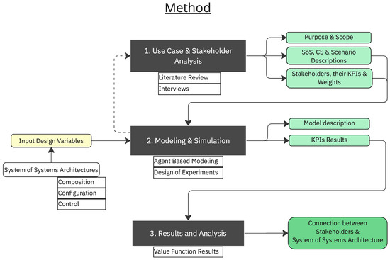 In the method’s first step, Use Case and Stakeholder Analysis, stakeholders are classified according to a new categorization of an Involvement Circle consisting of Operation Executors, Operation Managers, and those being Impacting or Impacted. To represent their interests, the Mission Engineering classification of KPIs is used. In the Modeling and Simulation step, an agent-based model is developed to simulate the most important SoS characteristics. The simulations are varied according to the SoS architecture definition of composition, configuration, and control. The Results and Analysis step uses value-model theory to combine the stakeholders’ KPIs in a value function to represent their combined satisfaction level, which can be compared between stakeholders. This helps to identify how the KPIs affect the value function results and, most importantly, which design variables of the SoS should have which values to satisfy which stakeholders.