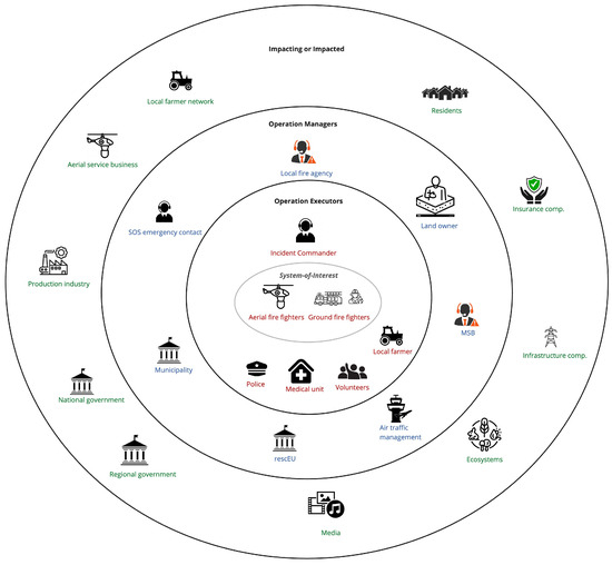 The identified stakeholders being (1) Operation Executors, (2) Operation Managers, or (3) Impacting or Impacted are presented in the Involvement Circle in Figure 2. The Operation Executors are: the Incident Commander (IC), local farmer with water tanks, police, medical unit, and volunteers, as well as the stakeholders operating the CSs in the system-of-interest, i.e., the aerial firefighters and ground firefighters. The Operation Managers are: the local fire agency, land owner, SoS emergency contact, municipality, national fire agency (MSB), air traffic management, and rescEU. The Impacting or Impacted are: residents, insurance companies, infrastructure companies, ecosystems, media, regional government, national government, production industry, Aerial Service Business, and the local farmer network.