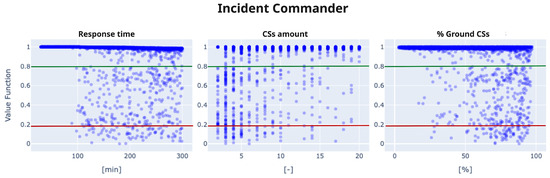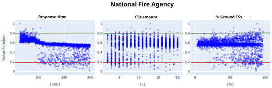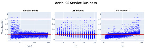 Design variables for bottom 20%: The bottom value function results can happen with any response time but are more prevalent when there is a short response time, explaining the positive correlation in the sensitivity matrix in Figure 7. It shows that the density of results is important; most cases with short response time result in bad results, but a few result in great outcomes, making response time an unreliable design variable. The CS amount shows worse results when there are many, i.e., more prevalent above ten CSs. The percentage of grounds CSs shows that with a lower percentage (more aerial CSs), there is a higher risk of obtaining a bad result.