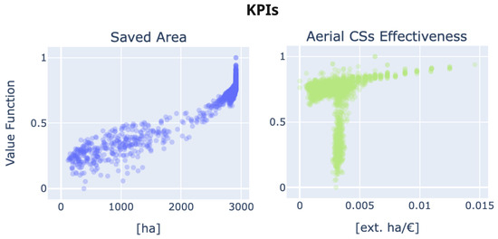 The KPI Aerial Efficiency is often low during the simulations (see Figure 14), which contributes to Aerial Service Business having low value function results. It is most often around 0.003 ext.ha/EUR, which is 20% of its maximum value 0.015 ext.ha/EUR, the same percentage as stakeholder 3’s most common value function value. The KPI is low due to the high hourly cost of EUR 1369 (see Table 2), and any increase in cost without a proportional increase in area leads to low efficiency. Efficiency KPIs are the most sensitive to design choices and tend to be low and skewed because costs scale faster than the area saved. An insight from this is that it is important to have a rigorous analysis of the KPIs in the model and the reasons behind their results.