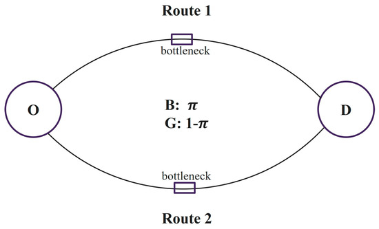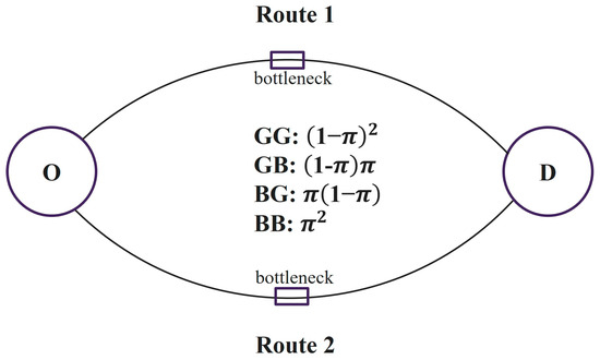 Consider the classical “two-route network” model as shown in Figure 1, in which a single origin (O) is connected to a single destination (D) by two routes. The traffic demand is fixed at . Assuming constant demand in a commuting corridor is justified, as we consider a long-run equilibrium, and the volume of daily commuters generally exhibits minimal fluctuation over a long period. Travel conditions on each route vary from day to day because of bad weather, accidents, roadwork, or other shocks. The state of the route, denoted as , is random and drawn from the set , where and represent the good (normal) and bad (incident) conditions, respectively. The traffic demand on route is denoted as . The travel time on route when it is in state is assumed to follow the canonical U.S. Bureau of Public Roads form [41],