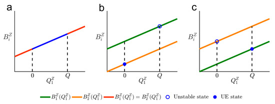 by solving . In this scenario, functions and are parallel (or identical) to each other. One has by substituting into . One can easily derive that since (Assumption 2). As a result, in this scenario, there are three possible UE patterns, as shown in Figure 2 and Table 2.