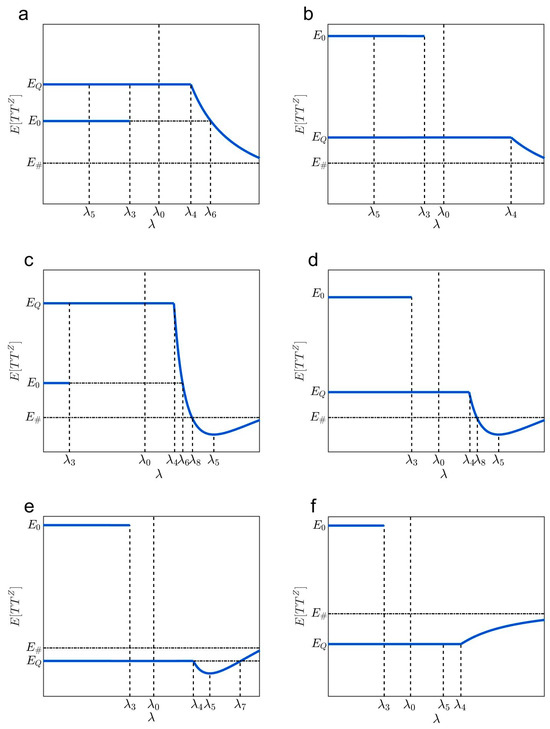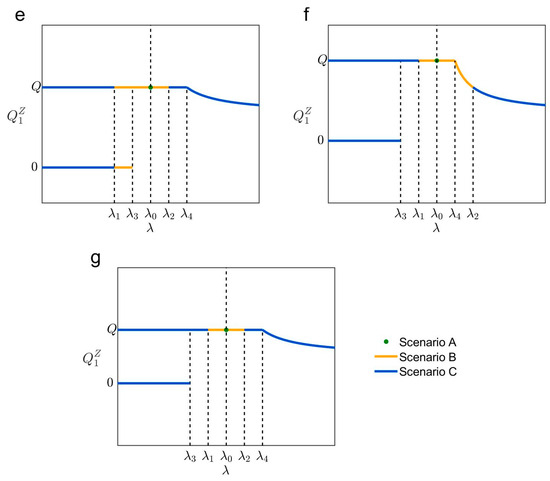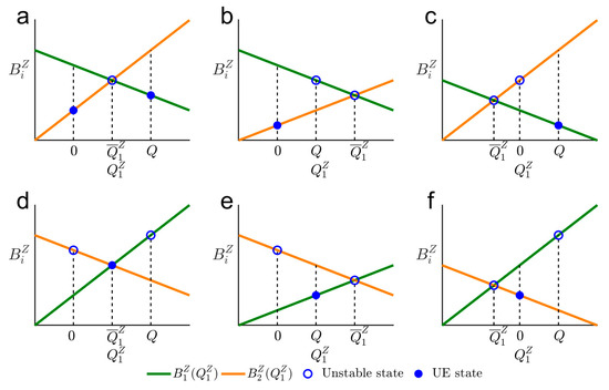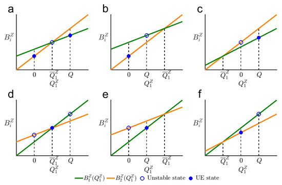 Obviously, scenario C exists when or . In this scenario, the equation has a unique solution, as shown in Equation (13), and the slopes of functions and have a different sign. As a result, in this scenario, there are six possible UE patterns, as shown in Figure 4 and Table 4.
