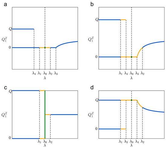 When , one has situation (iii). In this situation, when , pattern A1 exists, in which is not uniquely determined under UE, which can be any value between 0 and (). Moreover, patterns C1, B1, B4, and C4 exist when belongs to , , , and , respectively (see Figure 5c).