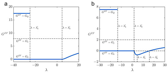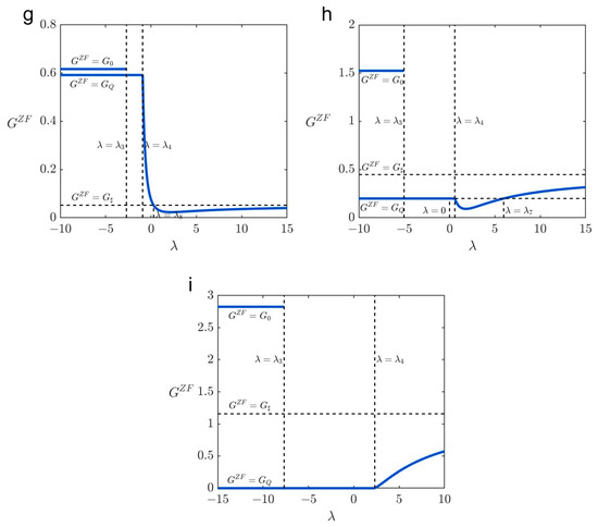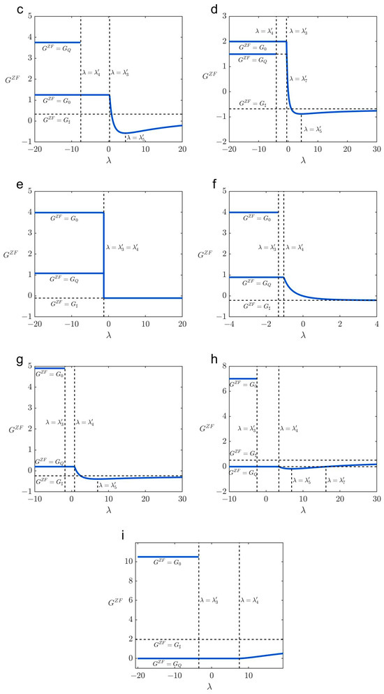 If , the function (13) of versus is a hyperbolic curve. When , the function is an increasing one for the two branches (see Figure 5a,b); when , the function is a decreasing one for the two branches (see Figure 5d–g). Note that the two branches are separated by . From Equation (13), can be less than 0 or larger than ; however, should be met.
