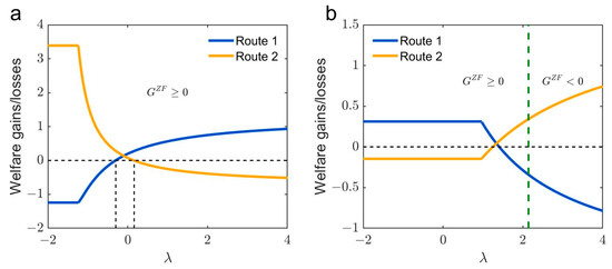 - If , together with (Assumption 1), one can easily derive that all travelers choose route 1 under UE, i.e., . Substituting into Equation (32), one has