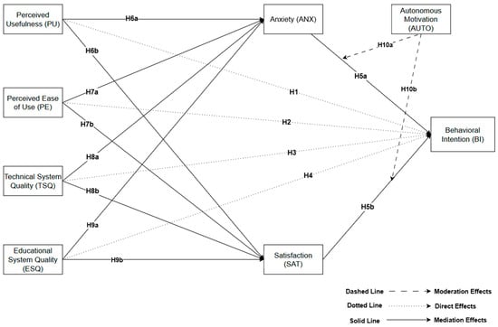 Conceptual model integrating the TAM with Affective and Motivational Extensions. Dotted lines: direct effects (H1–H4); solid lines: mediation paths via anxiety (ANX) and satisfaction (SAT) (H5a–H9b); dashed lines: moderation effects of autonomous motivation (AUTO) (H10a–H10b). Core predictors (PU, PE, TSQ, ESQ) appear on the left, mediators (ANX, SAT) in the center, and the outcome (BI) on the right.