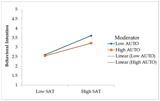Autonomous motivation (AUTO) moderates the relationship between satisfaction (SAT) and behavioral intention to use Moodle (BI).