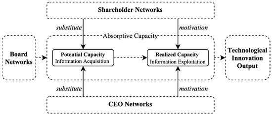 Although prior empirical research has widely acknowledged the important role of board networks in facilitating firms’ technological innovation—particularly in the context of information absorption—limited attention has been paid to how information absorption may be moderated by other interorganizational networks. In addition, existing studies have not disentangled the distinct processes involved in information absorption. To extend this line of inquiry, we integrate stakeholder network theory [24] with absorptive capacity theory [25] to investigate how two critical stakeholder networks—shareholder networks and CEO networks—moderate the roles of board networks in firms’ information absorption. Specifically, this study seeks to unpack the “black box” of absorptive capacity in the relationship between board networks and firms’ technological innovation output by distinguishing between potential and realized absorptive capacity, which correspond to information acquisition and information exploitation. Shareholder networks and CEO networks are defined as interorganizational networks formed through common shareholding and CEOs’ shared employment histories or educational backgrounds, respectively. Together with board networks, these two types of interorganizational networks may generate combined effects on firms’ technological innovation output [7,26].