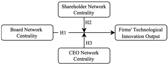 This study constructs a theoretical analytical framework to explore the influence of board networks on firms’ technological innovation output. It further investigates the moderating roles of shareholder networks and CEO networks, with a particular emphasis on their substitutive functions and motivational impacts. Drawing on social network analysis, centrality is widely recognized as the most direct measure of a node’s embeddedness within a network [33,35,43,44,59]. Accordingly, this study employs degree centrality to capture firms’ embeddedness in three types of interorganizational networks. A systematic investigation of these interaction mechanisms promises to advance the theoretical understanding of the organizational absorptive capacity [60]. The theoretical analytical framework is illustrated in Figure 1.