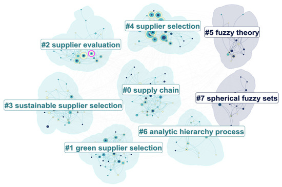 First, in the analysis of keywords, 208 unique keywords were identified after consolidating the raw data. Table 1 presents the top 20 high-frequency keywords, revealing that decision models, methodologies, and evaluation criteria for supplier selection constitute the primary research focus in this field. Moreover, adopting a systems-analysis perspective, scholars have increasingly integrated discussions on supplier performance evaluation, supply chain management, and order allocation. As illustrated in the keyword clustering diagram (Figure 1), under the broader imperative of sustainable development, recent studies emphasize suppliers’ sustainable and green attributes, reflecting heightened academic attention to suppliers’ performance in terms of environmental impact and social responsibility.