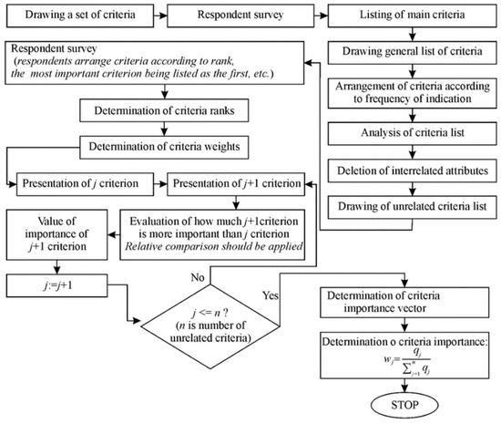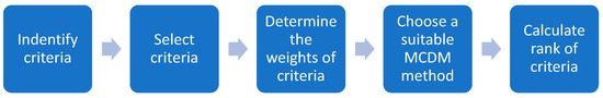 Most often, the initial stages of traffic planning involve civil, architectural, mechanical, traffic, geodesy, and other experts. An objective and authoritative assessment of planned systems is not possible without understanding the influence and importance of numerous factors and criteria. One of the prerequisites for the application of multi-criteria analysis procedures is the determination of combinations of selected criteria, determination of weighting coefficients, and ranking of criteria using the selected MCDM method, as shown in Figure 1 [8]. Determining the importance of criteria or preferences considers the assessments of selected experts.