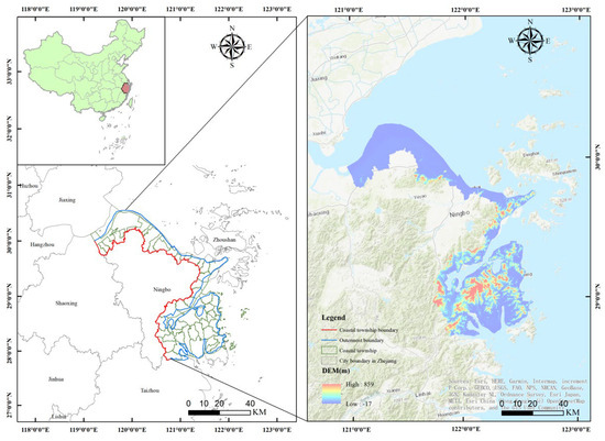 Ningbo is located on the eastern coast of Zhejiang Province in China (28°51′~30°33′ N, 120°55′~122°16′ E), bordering the East China Sea, in the middle of the mainland coastline, with Hangzhou Bay to the north and Zhoushan Islands to the east. Ningbo’s coastal zone is geographically diverse, including different types of coastal landscapes such as coastal urban areas, harbor terminals, beaches, and islands. The total sea area of the city is about 8041 km2, and the total length of the coastline is 1685.7 km. Ningbo, as a large marine city and a major port city on the mainland coast, is the economic center of the southern wing of the Yangtze River Delta. The dense population and socio-economic activities have caused greater real disturbances and potential pressures on the ecological environment. The degree of artificiality of the coastline is relatively high, and the natural landscape resources of the coastline have been destroyed, resulting in the fragmentation of the coastal landscapes. In the past two decades, Ningbo City has actively responded to the national policy on reclamation and issued a number of local policies, which have played a key role in the development and protection of Ningbo’s coastal zone area. With the successive implementation and promotion of these policy documents, the development activities of reclamation in Ningbo’s coastal zone have gradually become standardized, proceduralized and institutionalized. In this paper, with reference to existing studies, the landward side of the coastal wetland boundary is defined as the inner boundary of the coastal township, and the seaward side is defined as the outermost boundary of the superimposed continental coastline, so as to determine the scope of the study area by combining the closed area generated by the landward and seaward boundaries (Figure 3) [26].