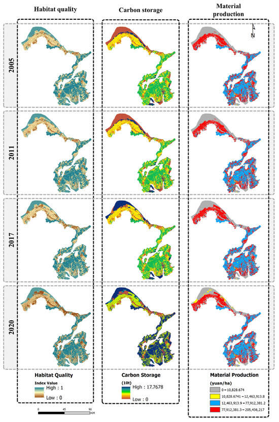 It is important to recognize that although the above-mentioned spatio-temporal patterns are quantified based on the LULC data, the actual observed changes in ecosystem services may be the result of the complex interaction of multiple driving factors [6]. In addition to the significant impact of LULC transformation driven by human activities such as coastal reclamation and urbanization, broader environmental factors such as climate change (such as variations in sea surface temperature, sea level rise, storm frequency/intensity), and the intrinsic dynamics of coastal ecosystems (such as natural succession, fluctuations in nutrient cycling, and species interactions) will also inevitably have an impact on habitat quality, carbon storage, and material production [3].