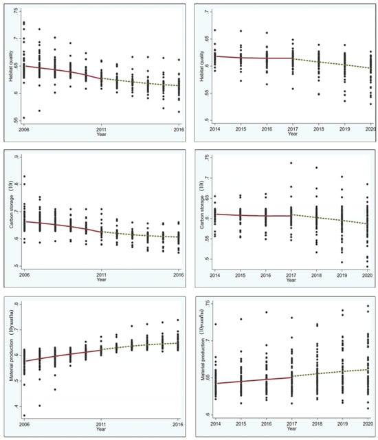 Figure 5 and Figure 6 are the fitness curves of four RD models for the three ecosystem services of habitat quality, carbon storage, and material production, respectively. Table 1 is the coefficient of treatment variable and its significance test. As Table 4 shows, reclamation policies have a significant effect on the ESs. Except for model 1–2, the other two treatment variables passed the significance test. The changes in habitat quality generally coincided with the implementation of the reclamation policy. From 2006 to 2016, including the implementation of the reclamation plan indicator control policy in 2011, its effect was not particularly significant in Figure 5, but it suppressed the downward trend of habitat quality to a certain extent. In the latter years of the policy, a certain degree of growth was realized in some areas, as shown by a higher growth rate after the implementation of the policy than before. In Figure 6, we can see that the increasing trend of habitat quality is completely different from 2011. The increase in ecological value has become smaller before 2011 and the annual increment has become larger after 2011. The reclamation policy in 2011 had a positive effect on the annual increment of habitat quality, and the annual increment of habitat quality after 2011 increased by 0.375 compared with that before 2011. When the reclamation was completely banned in 2017, the quality of habitat quality in some areas had a certain degree of improvement. However, the effect of the policy is not sustainable. The reclamation policy in 2017 had a negative effect on the annual increment of habitat quality, with the annual increment of habitat quality after 2017 decreasing by 0.172 compared to that before 2017.