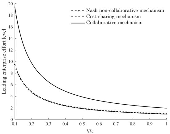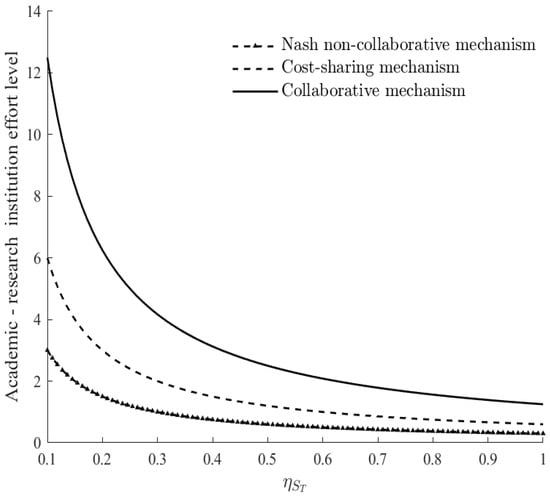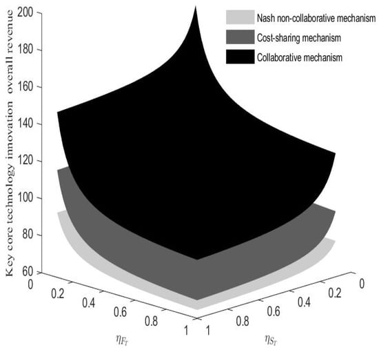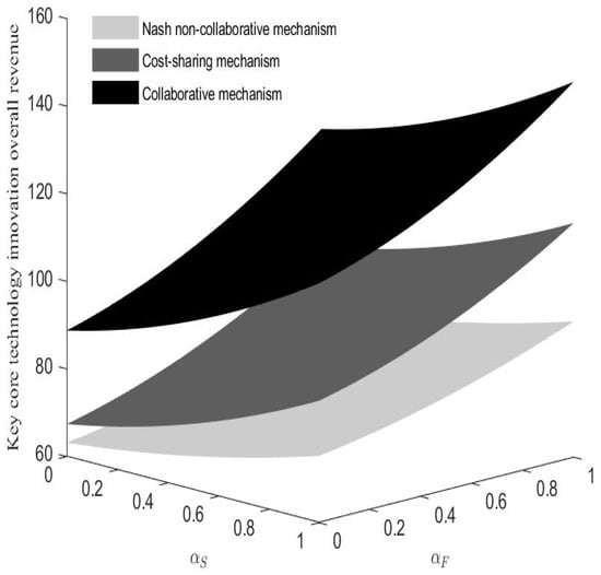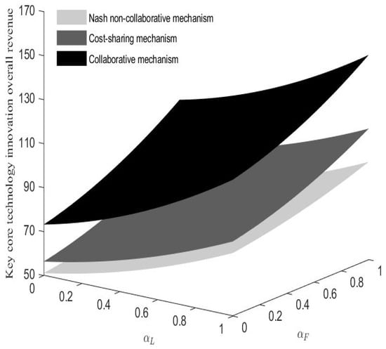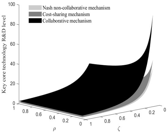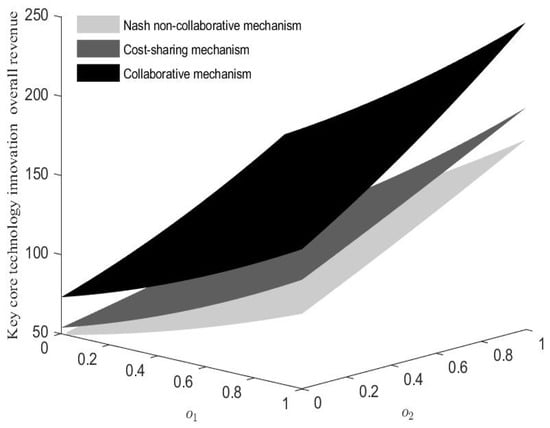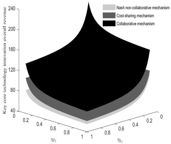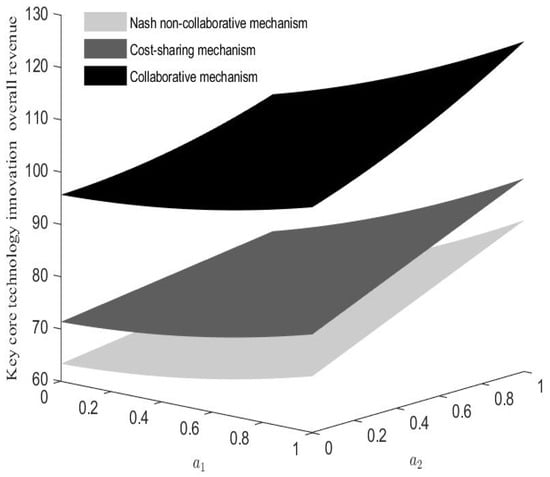 Proposition 6 illustrates that the system revenues under the Nash non-collaboration, cost-sharing, and collaboration mechanisms include technology R&D revenues and cover key core technology innovation’s market revenues. Within a certain threshold range, the optimal revenues of leading enterprises, supporting enterprises, and academic research organizations in the cost-sharing mechanism, as well as the overall revenues of the system, are higher than the corresponding values in the Nash non-collaborative mechanism. Further, under the collaborative mechanism, the system revenue of key core technology innovation reaches Pareto optimization. These results show that, on the one hand, under the premise of guaranteeing the expected revenues of leading enterprises, the behavior of these enterprises in sharing the innovation costs of supporting enterprises and academic research institutions effectively reduces the R&D risks of all parties, which plays the role of innovation incentives and thus increases the revenues of innovation entities and the overall system. On the other hand, the collaborative mechanism can effectively integrate the heterogeneous resources of innovation entities and coordinate the interests of all parties to achieve Pareto optimization of the overall revenues within the system.