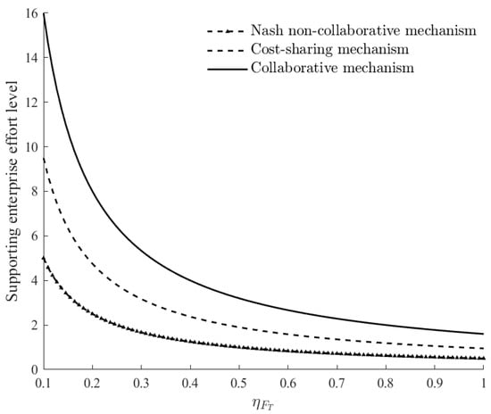Proposition 2 shows that, under the cost-sharing mechanism, the behavior of leading enterprises in subsidizing the costs of supporting enterprises and academic research institutions is subject to specific conditions. Specifically, leading enterprises are motivated to bear the costs of key core technology R&D and market promotion only when the impact coefficient () of the efforts of supporting enterprises and academic research institutions on leading enterprises’ revenues exceeds a certain threshold. The results align with the common perception that, as commercialized innovators, leading enterprises’ decision-making behavior follows the cost–revenue principle and the assumption of rational economic actors. In other words, the cost–subsidy decision is economically justified only if the R&D efforts of supporting enterprises and academic research institutions can generate significant marginal revenues for leading enterprises. Additionally, the incentive-compatible mechanism based on the optimal threshold can effectively stimulate the enthusiasm of supporting enterprises and academic research institutions for R&D investment, which helps effectively alleviate the imbalance between innovation resources and the “free-riding” behavior caused by the moral hazard and information asymmetry [,]. In contrast, if the R&D efforts of supporting enterprises and academic research institutions yield revenues to leading enterprises that are lower than the associated subsidy costs and anticipated revenues, these leading enterprises are generally hesitant to share the innovation costs.