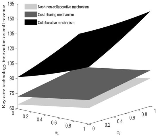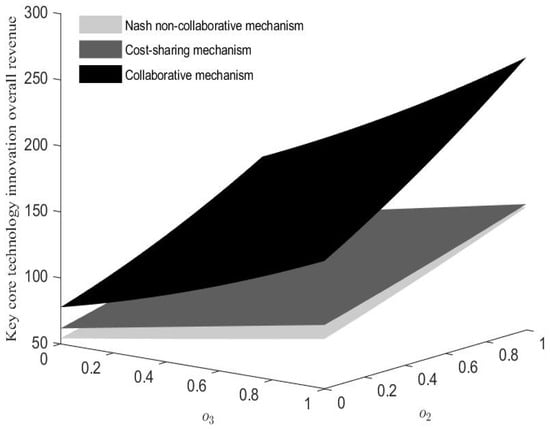 As Figure 4 and Figure 5 show, the overall revenue derived from key core technology innovation initially declines before stabilizing as the cost coefficient increases. According to the principle of risk aversion, high innovation costs increase the risk of R&D failure for innovators, which is not conducive to improving the overall system revenue. In addition, high innovation costs will weaken the willingness of entities to innovate and reduce their innovation input. With respect to system revenue, total revenue is maximized under the collaborative mechanism, followed by the cost-sharing mechanism. In contrast, system revenue under the Nash non-collaborative mechanism is significantly lower than that of the other two mechanisms.