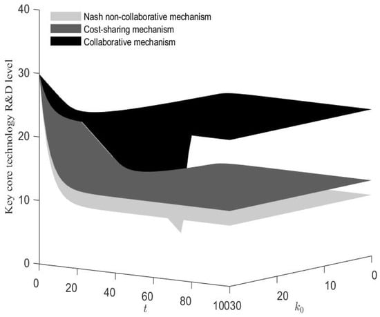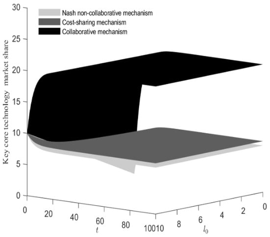 As Figure 12 and Figure 13 show, there are significant differences in the equilibrium states of key core technology R&D levels and market share under different mechanisms. Specifically, under the non-collaborative mechanism, the equilibrium values of key core technology R&D level and market share are 10% and 6%, respectively; under the cost-sharing mechanism, these increase to 12% and 7%; and under the collaborative mechanism, the R&D level and market share of key core technology rise to 24% and 20%, respectively. These results suggest that in the early stages of key core technology innovation, when the system’s key core technology R&D level and market share are relatively low, decentralized decision making by leading enterprises, supporting enterprises, and academic research institutions can effectively achieve key core technology innovation. When the initial key core technology R&D level and market share are at a medium level, the cost-sharing mechanism can better coordinate system members’ behavior to achieve a higher technology R&D level and market promotion effect. These results further verify that the cost-sharing mechanism can play a role in promoting key core technology innovation by sharing R&D costs and risks, alleviating conflicts of interest among system members, and promoting resource sharing between system members. When the system’s R&D level and market share of the key core technology are at a high level, leading enterprises, supporting enterprises, and academic research institutions can further achieve the improvement of technology R&D level and market share by adopting collaboration innovation strategies. This is primarily because such a collaborative mechanism fosters deep integration of resources and forward-looking learning among innovation entities, enabling them to swiftly adjust their R&D direction and respond to market demands. At this point, innovation entities aim to maximize system revenues, thereby achieving a greater degree of synergistic improvement in technology R&D levels and market share of the three parties involved in the game. The results show that the R&D and market promotion effects of key core technology are highly dependent on the collaboration mechanism between innovation entities. At different stages of technological innovation (low, medium, and high R&D levels), differentiated collaborative mechanisms should be adopted.
