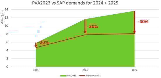 The problem under analysis that justified the critical look in this case study is related to the discrepancies in the sales estimate and the real demand, in the year 2024, for the Low Pressure Sensor (LPS). The PVA 2023 document, which contains sales forecast information for the years 2023 through 2028, presented forecasts for LPS sensor sales that were significantly higher than actual demand figures. More specifically, as shown in Figure 1, the 2024 sales forecasts exceeded actual sales by approximately 4 million units—a substantial discrepancy for a business unit. This significant forecasting error can have serious financial implications, as it impacts production planning, inventory management, resource allocation, and logistics strategies. The resulting inefficiencies lead to reduced profit margins and, ultimately, a loss of expected revenue.