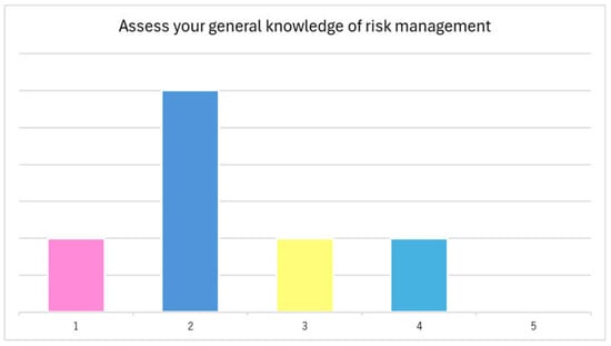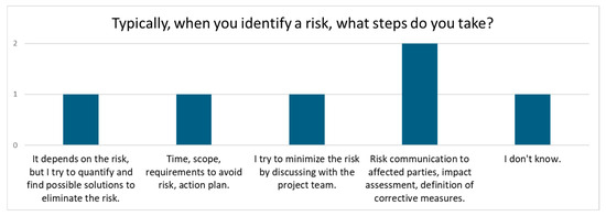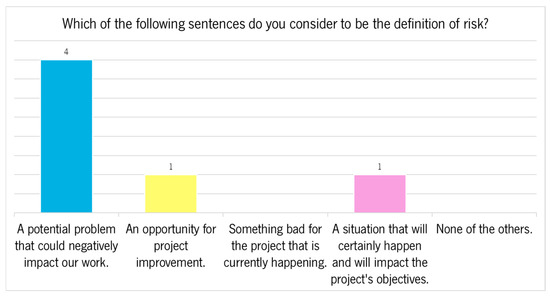 According to the literature, the correct answers to this question would be the options “A potential problem that could negatively impact our work” [56] and “An opportunity for project improvement” [57]. This question makes clear the negative view that the department has of risks, with more focus on risk as a threat. Only one member considered it an opportunity. Another issue that emerges is the lack of clarity in the difference between concepts such as risk, problem, and the probabilities. The option “A situation that will certainly happen and will impact the project’s objectives” refers to the definition of a problem, and the results show that one team member considers that a situation with a 100% probability of occurrence is also a risk, when it is a fact.