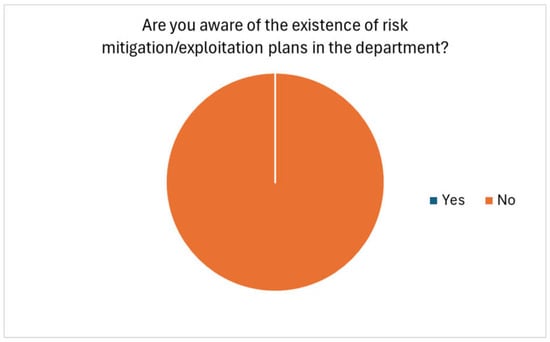 Regarding the question “Are you aware of the existence of risk mitigation/exploitation plans in the department?”, the responses in Figure 10 reveal that such plans are nonexistent. This indicates that, even after risks are identified, there is no structured approach to addressing them—highlighting a critical gap in the department’s risk management process and a lack of follow-up mechanisms.