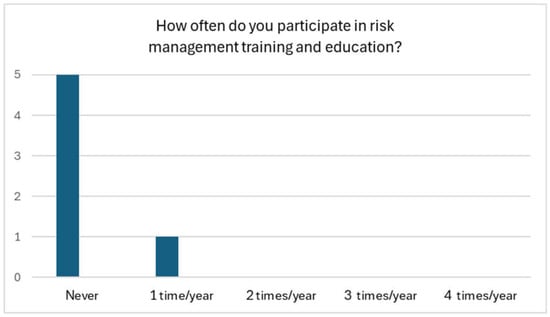 Figure 11 presents an assessment of the frequency of participation in training and education on risk management. The results show that only one of the members participates in these trainings once a year while the other five never participate. After asking the department about the reason for the poor attendance, the answers gathered point to a lack of training on the part of the company.