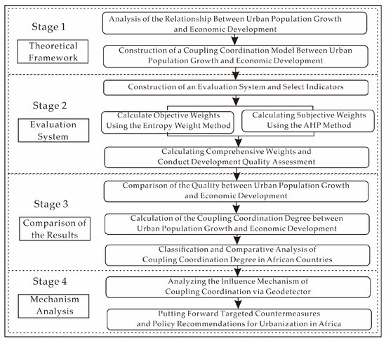 In this study, urbanization is defined as the comprehensive process of rural–urban migration, economic restructuring, and social transformation. Urban population growth specifically refers to changes in population structure and employment shifts toward non-agricultural sectors. Urban economic development encompasses changes in economic scale, industrial structure, the market environment, trade and consumption levels, and the infrastructure environment under the influence of urban population growth, as outlined in Section 2. This study hypothesizes that there exists an asymmetric coupling dynamic relationship between urban population growth and economic development in African countries, where the level of economic development often lags behind population growth. Factors related to industrialization and governance are identified as key drivers of coordinated development. Under this hypothesis, this paper first analyzes the coupling and coordination relationship between urban population growth and economic development, constructs an indicator system to systematically evaluate the relative quality of their development and the coupling coordination degree, and uses the GeoDetector tool to analyze the influence mechanism of coordination. The specific research framework is shown in Figure 1.