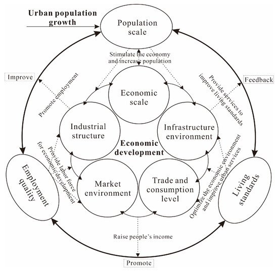 The relationship between urban population growth and economic development represents a significant focal point within the field of urbanization research [5,17]. Recent studies shed light on the intricate relationship between urban population growth and economic growth, as well as the correlation between urban size and economic development [18]. The process of urban population growth can promote economic development. Additionally, urbanization plays a pivotal role in alleviating poverty in rural areas, which is mainly achieved by increasing the demand for agricultural products and adding more non-agricultural jobs [19]. The increasing population in urban areas leads to a greater number of individuals participating in non-agricultural production. At the same time, the growth of the urban population generates an increased demand for goods and services within the urban economy, thereby positively impacting its expansion [20]. The positive effect of urban population growth on the urban economy is not static. Rapid urban population growth rates are often accompanied by challenges such as increasing unemployment rates and the expansion of slum populations within cities. The rapid and unreasonable expansion of urban areas also contributes to various environmental problems and management crises, ultimately posing a threat to economic development [21,22].