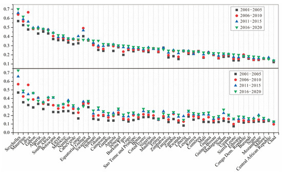 We assessed the quality of urban population growth and economic development in African countries over the period 2001–2020 according to Equation (7). The results are shown in Figure 3 and Table 3. Over the past 20 years, the average quality of urban population growth in African countries has shown an increase from 0.272 to 0.309. However, the overall level remains relatively low. The coefficient of variation fluctuates between 0.392 and 0.436, indicating large differences between African countries. The average quality of economic development of African countries increases from 0.158 to 0.217, with an overall level lower than the quality of urban population growth. The coefficient of variation, on the other hand, fluctuates between 0.402 and 0.498, with greater differences between African countries. Furthermore, Figure 3 demonstrates a consistent spatial distribution pattern of urban population growth and economic development across African countries. Countries like Seychelles and Mauritius exhibit the highest overall levels, whereas countries like Chad and the Central African Republic have the lowest overall levels. This observation lends support to the existence of a closely intertwined coupling coordination mechanism between urban population growth and economic development in Africa.